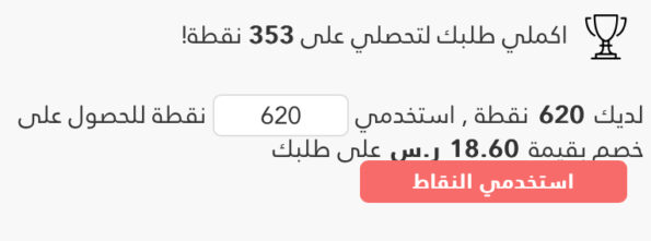 يمكنك تحويل نقاطك إلى خصومات مالية في صفحة إتمام الطلب من خلال تحديد قيمة النقاط المراد استخدامها والحصول على خصم بقيمة هذه النقاط ، كل مائة نقطة تعادل 1 ريال :